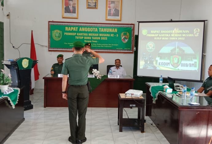 Letkol Inf Eko Wahyu Sugiato selaku Dandim 0119/BM meyampaikan, rapat anggota tahunan Primer Koperasi Meriah Musara Ke-III sebagai evaluasi dan pertanggung jawaban pengurus primer koperasi kartika Meriah Musara kepada seluruh anggota Koperasi.