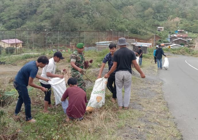 Rajawalibaruna.com | Redelong – Serda M. Hadis Babinsa Koramil 05/Permata, Bhabinkamtibmas Nakes Puskesmas Buntul Kemumu dan warga melaksanakan gotong royong membersihkan sampah di sepanjang jalan KKA tepatnya di Desa Buntul Fitri hingga Desa Burni Pase, Kecamatan Permata Kabupaten Bener Meriah. Jumat 27/01/2023