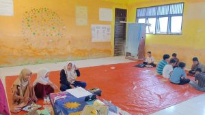 Para murid terlihat membawa buku tulis sendiri dan meletakkannya langsung di atas lantai yang dingin untuk mengerjakan tugas. Kondisi ini tentu sangat mengganggu konsentrasi belajar dan berpotensi mengganggu kesehatan anak-anak dalam jangka panjang.
